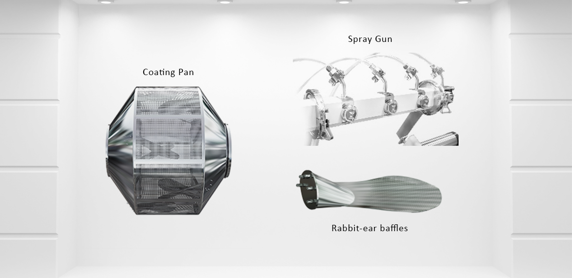 - Rabbit-ear, Tubular baffles, Plate type baffle is use as per tablet shape, coating process and customers need